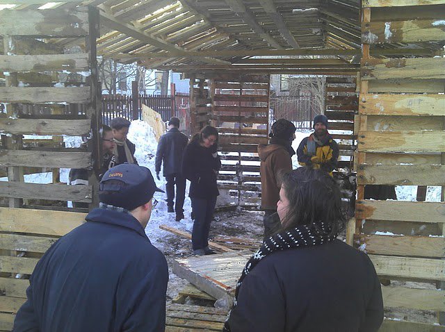 Laurel: For the most part it does. For the day-to-day maintenance, my friends and I don’t have to do much of anything, unless we feel like it. But for larger issues, we do sometimes need to step in. When the “roof” (which was just a tarp) collapsed during the blizzard, it was clear that there was a major problem that was bigger than an individual could or would fix. So we got a group together to come in and build a permanent structure out of wood from pallets that were gifted to us by Home Depot. More than a dozen of us came out in the freezing snow for the “roof raising,” and several more people we didn’t even know came in off the street to help, motivated only by their common belief in the project, which was a really empowering thing. This whole project has been extremely educational and personally fulfilling, watching my philosophies come to life, and it gives me great hope for humanity and the future.