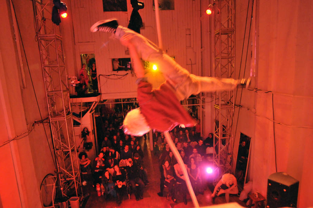 Besides putting on phenomenal shows in a fantastic converted warehouse—in one of the most vibrant corners of East Williamsburg, down the block from 3rd Ward, Werdink, Shea Stadium, the former Bushwick Project for the Arts and Bushwick Music Studios, and more—many of the House of Yes gals make up the loose conglomeration of female acrobats Lady Circus, and they are tireless, performing at all the best underground Brooklyn parties and Manhattan cabarets, like Shanghai Mermaid and Café Panache, among many many others. And the mainstream world is taking notice: the Lady Circus performers were featured as a costume-design challenge on the incredibly popular show Project Runway in 2011!