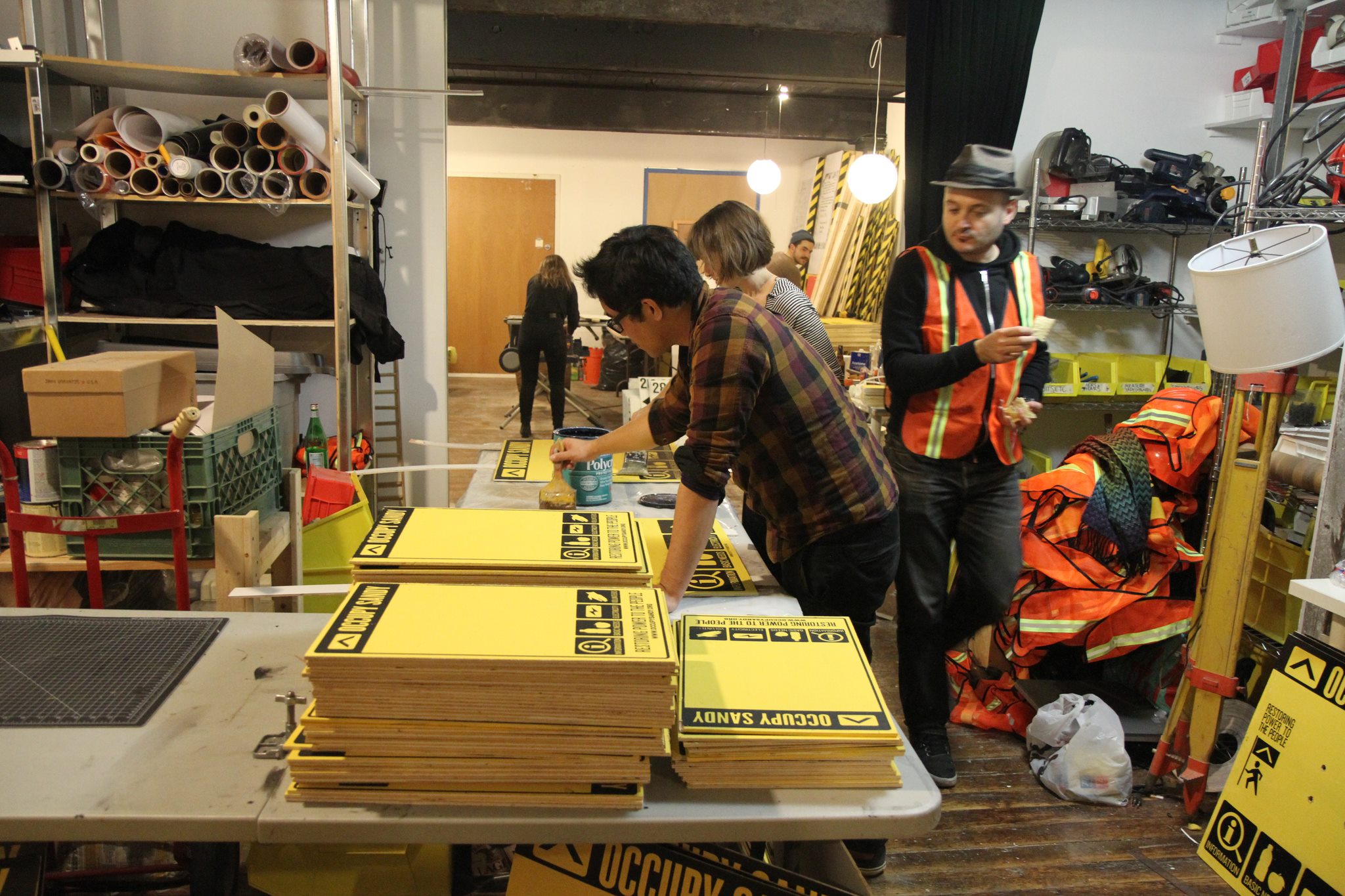 The new space, in industrial Greenpoint, has coworking desks in the back and a production facility in the front. The group and the space have been very active in Occupy Wall Street, Occupy Sandy, and many other Occupy and activist permutations. A large part of NAA’s disaster-relief contribution has been designing and producing visual symbols for the movement, such as vests, magnets, patches, and “way-finding” signs, to clarify and make physical the incredible work that Occupy Sandy has been doing since the superstorm hit. This work has been done in conjunction with Occupy Town Square, Pratt’s Disaster Resilience Network, and the Wise City.