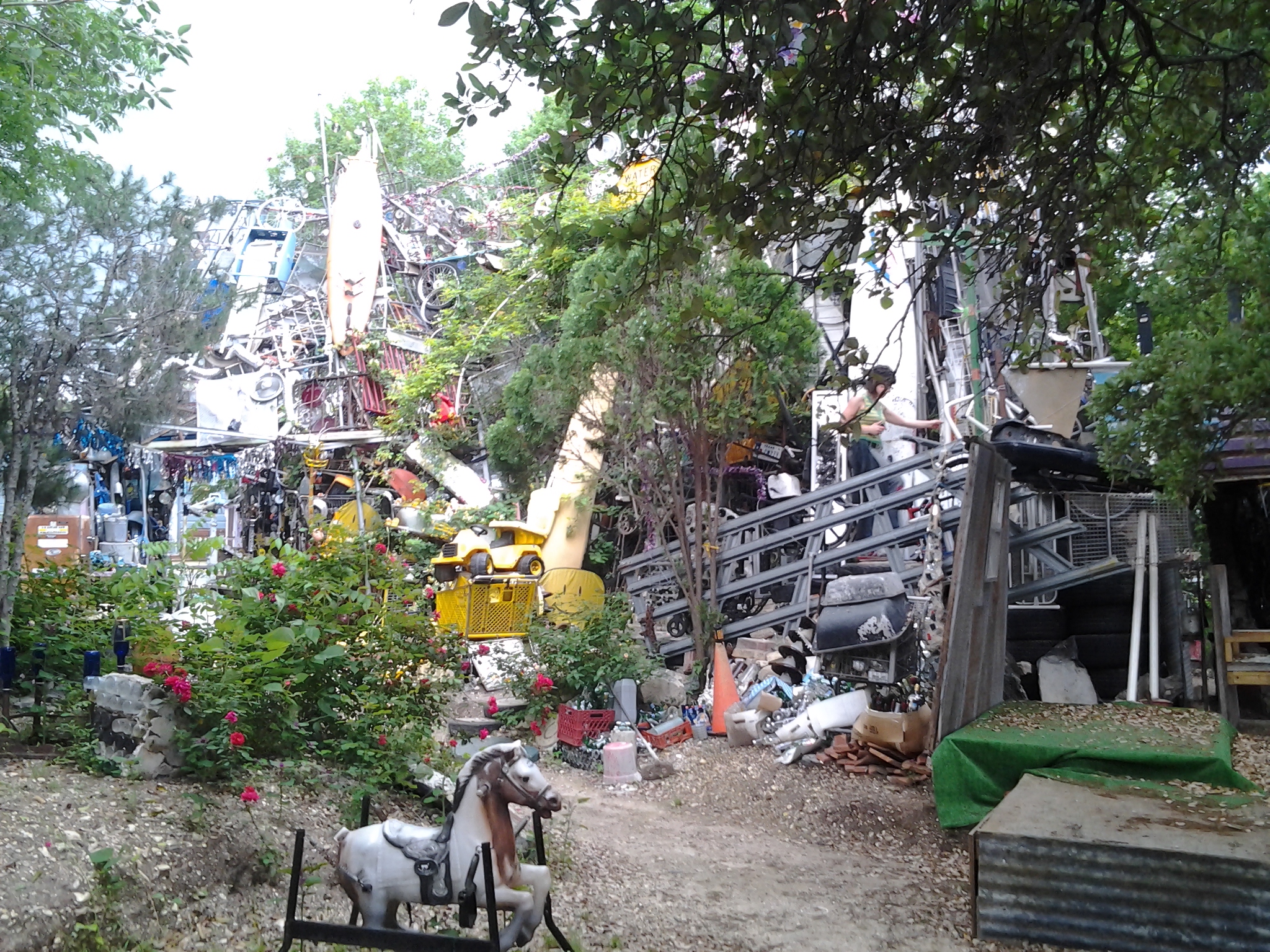 The photos should speak for the Cathedral itself. The main structure is three stories high and has several little rooms. It is made of just about everything you can think of: bicycle parts, lawn chairs, decapitated Barbies, a rusted fridge, crutches, a diving board bridge, zillions of plastic trinkets, cement-filled tires, busted electronics, glass bottles, a box spring, road signs, bathtubs, CDs, broken toys, car seats, shopping carts, and countless knickknacks of all sizes that are a lot harder to identify. There are a bunch of satellite statuettes, a few junk shacks, and smaller sculptures. It’s altogether a fantastic mess, and so so so worth a visit.