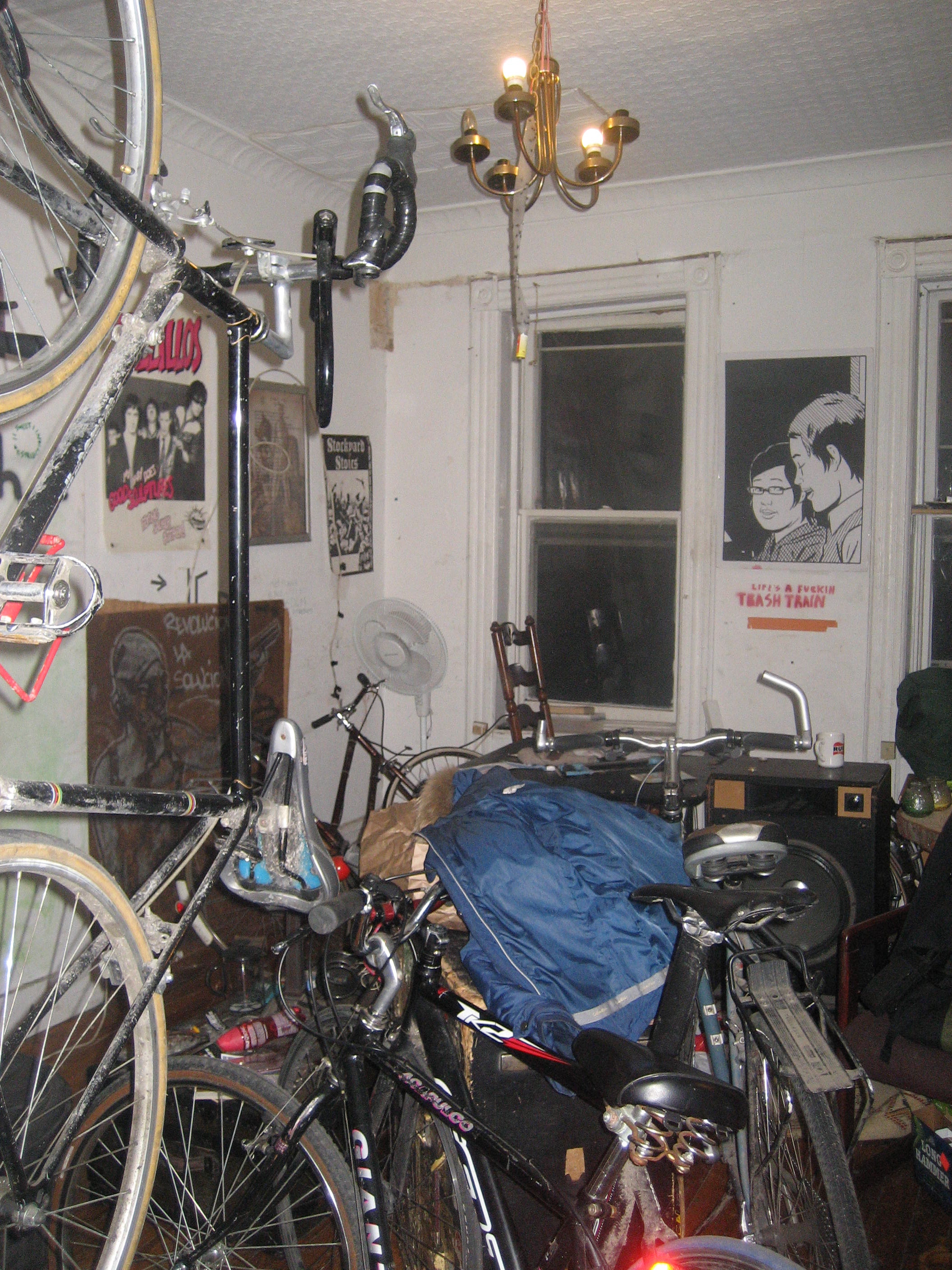 It’s housed in a fancy-looking brownstone, and in fact I was worried that I had the address wrong, until a couple of pierced boys with torn shirts let me in. It’s a terrific mess in there, full of bikes and records and ashtrays and posters and busted chandeliers and foam-leaking sofas and sagging stuffed animals and speakers and graffitied subway signs. It’s, in other words, an incredibly loved space.